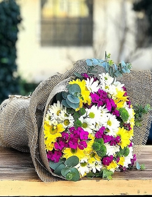beyaz papatya kasım patları ile hazırlamış sade ve şık buket